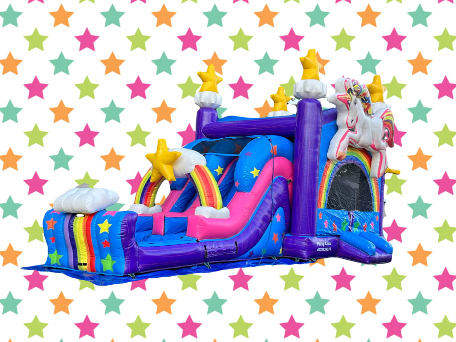 ntroducing the Unicorn Combo! The Unicorn Combo is custom-designed for stability and steady rental usage. The Unicorn Combo has a blue, purple and pink color scheme with 3D printed unicorns on the side of the combo. This combo has a large bounce pad with basketball hoops and a slide It is the perfect ride to emphasize for all occasions.