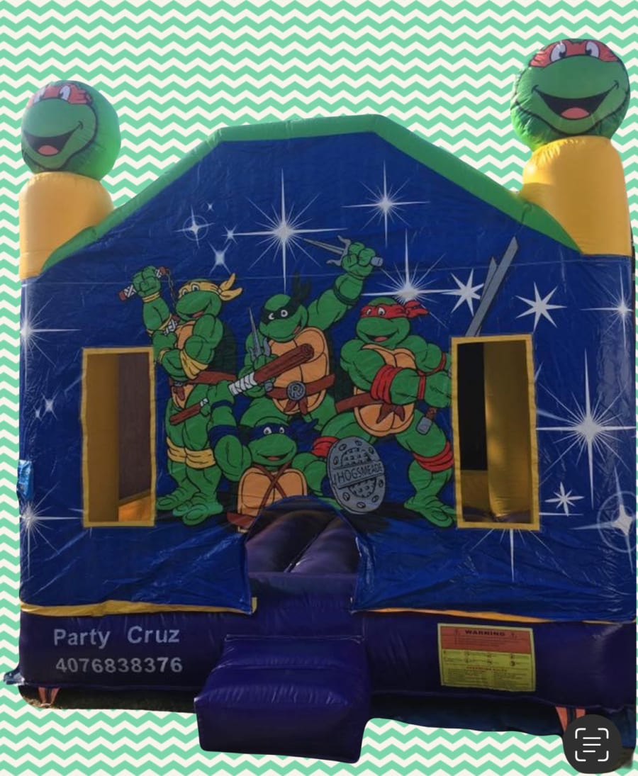 Hang out with Leonardo, Donatello, Michelangelo, and Raphael who are most commonly known as the Teenage Mutant Ninja Turtles. Get ready to have a good time jumping with the turtles. Our Teenage Mutant Ninja Turtle bounce is perfect for any fan of the Ninja Turtles that is ready to get their turtle power on. Boys and girls of all ages can enjoy this bounce house. Toddlers may need some help climbing in but they will have a great time inside. The Teenage Mutant Ninja Turtle Bounce House is covered to shield the kids inside from the sun or weather. It comes with a 1HP Blower when rented. This is a very popular bounce house as it is flexible to go with girls or boys and various themes of parties.