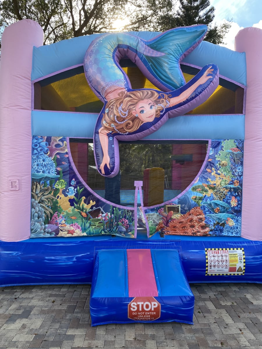 Bounce Houses R Us is proud to present our Mermaid Bounce House rental. Are mermaids real or make believe? Mermaids are real at Bounce Houses Us bring you and guest under the sea with our full themed Mermaid Bounce House rental. Our beautiful mermaid bounce house rental features a beautiful 3D Mermaid with red long hair and a colorful turquoise tail with green scales. Our mermaid swims under the sea where life is so much better with colorful fish, beautiful shells, and a 3D starfish. The Mermiad Bounce House features four exciting activities to keep your guest entertained for hours of fun. These fun activities include a jump area, a basketball hoop Our Mermaid bounce house rental is the perfect way to combine fun and a healthy physical active. Our Mermaid Bounce House also goes well with under the seal themed events.