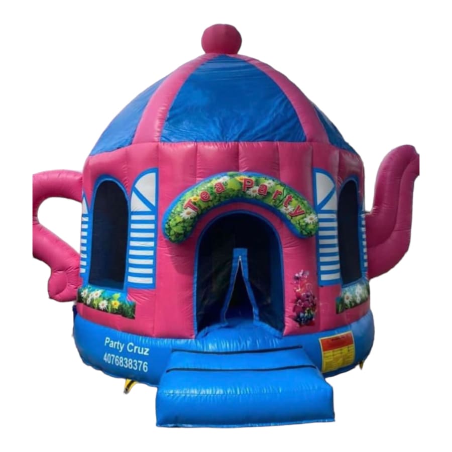 Inflatable Party Magic features this precious tea party themed bounce house rental to meet every little girl's tea party dreams. This bounce house is 3D and absolutely beautiful. What little girl doesn't want to play dress-up and have a tea party for their birthday? Now we offer a bounce house to match the theme. There is also a basketball goal inside to add to the excitement of the bounce house. The entire bounce house is shaped like a teapot and is designed to look like a teapot house complete with windows and doors. This teapot bounce house rental is best suited for ages 2-12 but can be enjoyed by "big kids" and adults as well. The cute graphics and design this bounce has to offer will not disappoint. Let this beautiful teapot bounce house rental be the centerpiece of your little girls party and stand out from the crowd with this unique bounce house. Having a tea party? This tea party bounce house will add the ultimate compliment to your party.